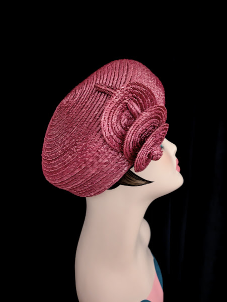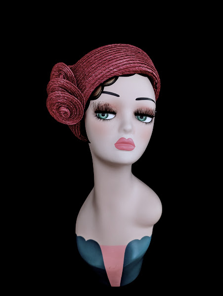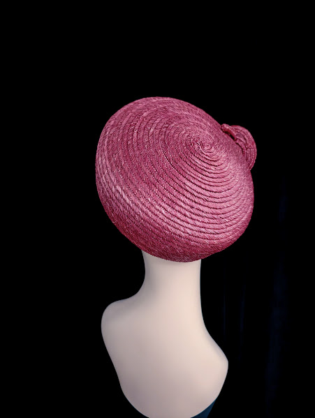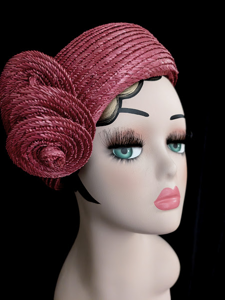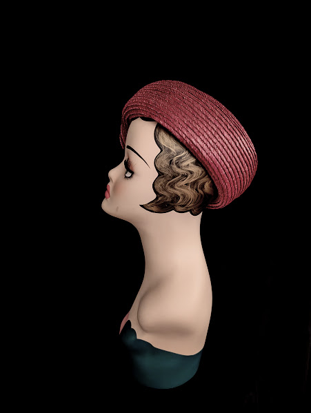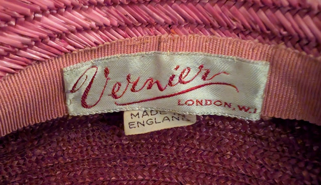 A beautiful example of Madame Vernier’s straw hats of the 1950’s. The color of the hat is a mauve-ish rose with a hint of purple. The hat size is about 6.75 (that was determined by using a hat measuring device and that is a U.S. size). It’s well made and has its original tags of where it was made and by who.