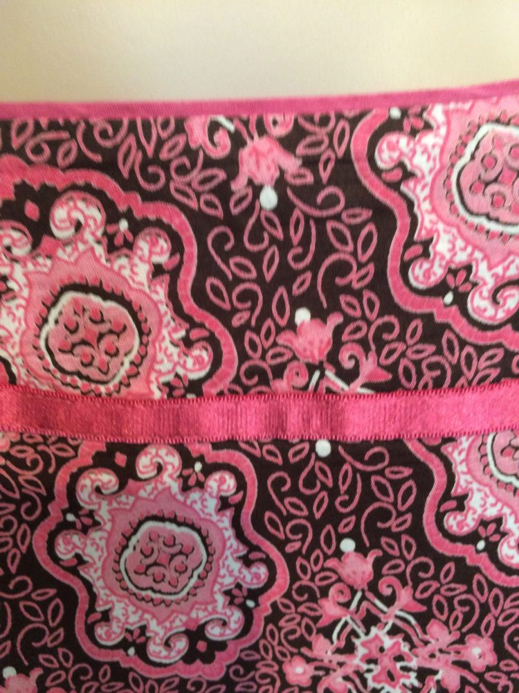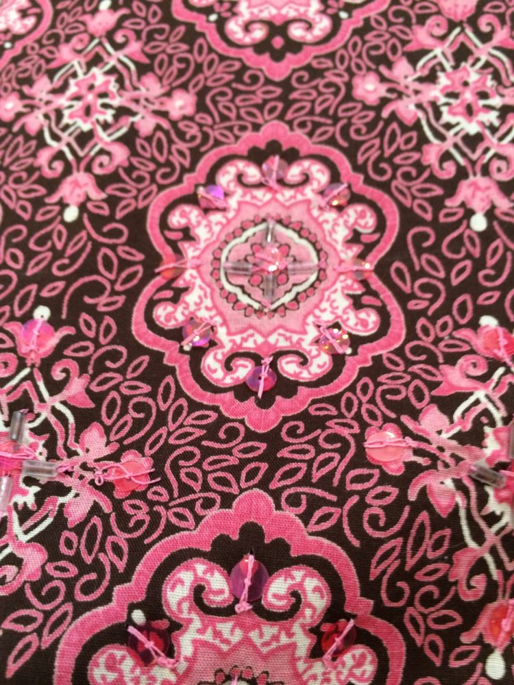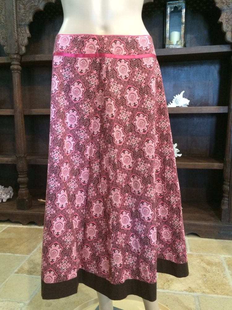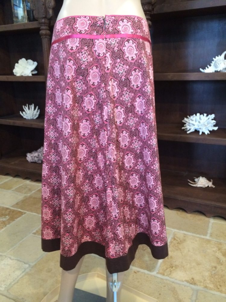 Perfect for a stroll on the beach! This cute A-line skirt in pink and brown is accented with sequins & beads at the bottom of the skirt.