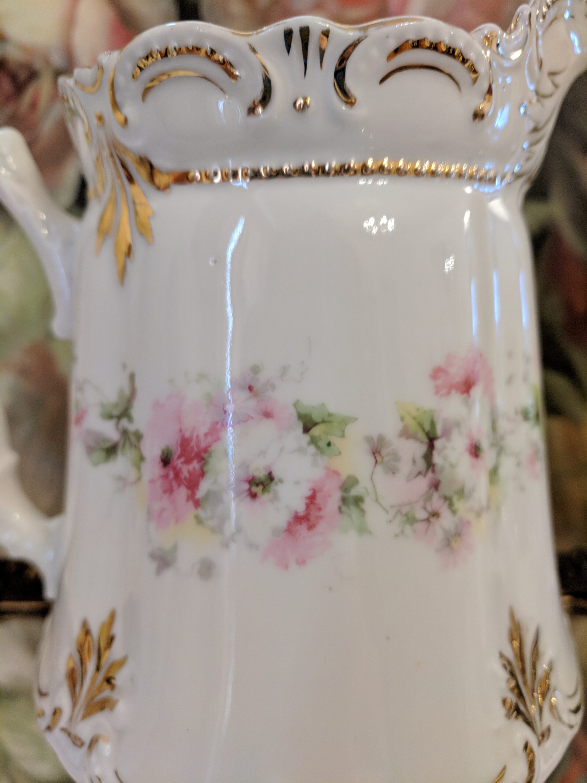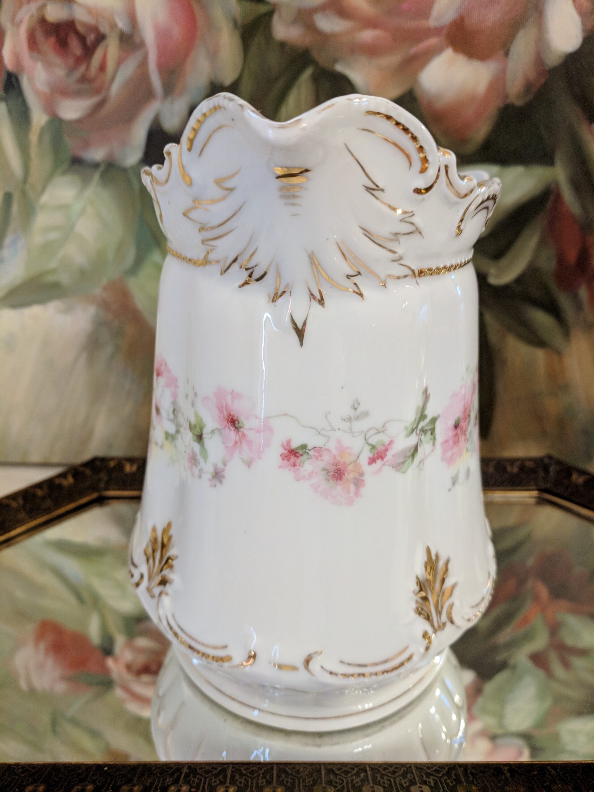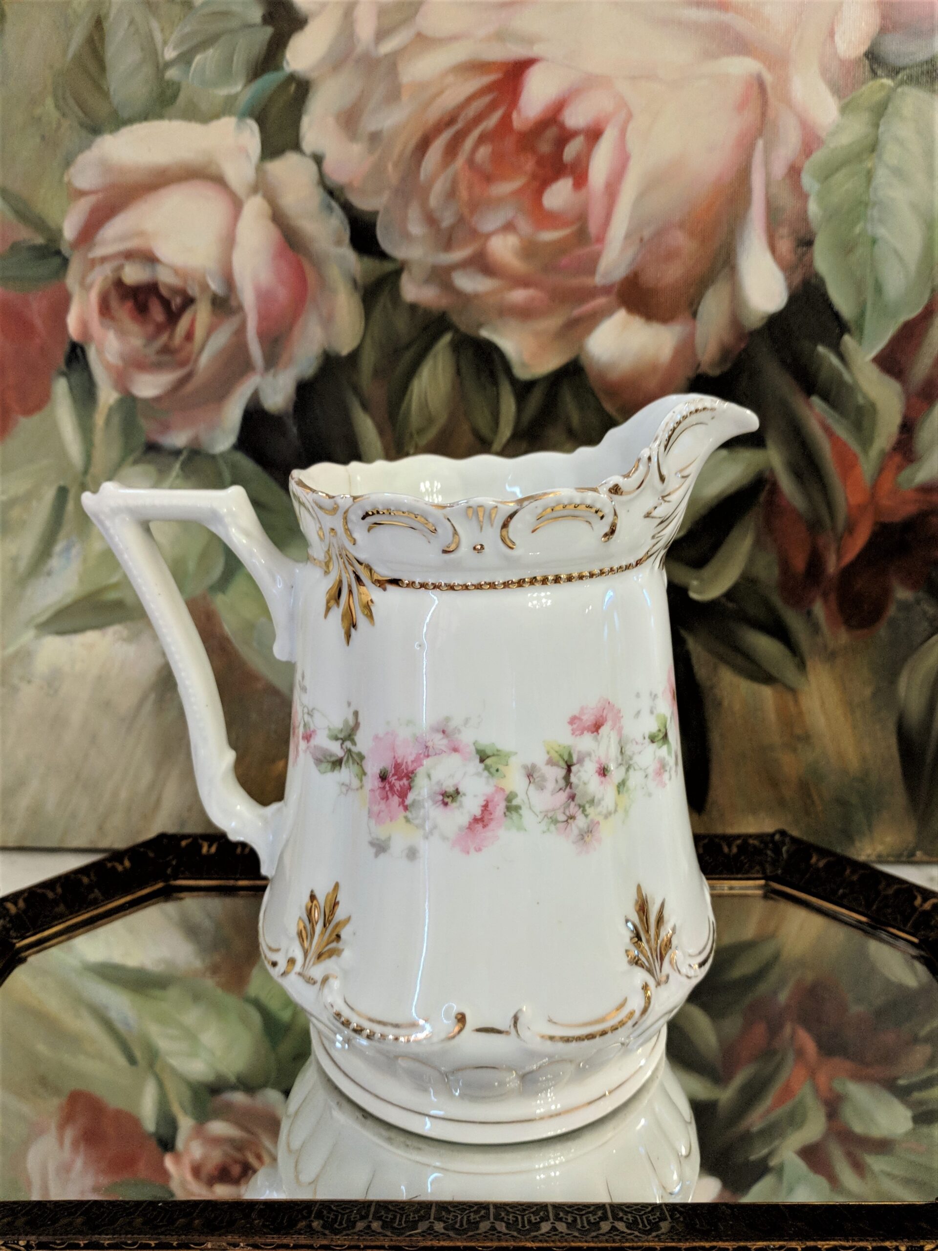 Lovely, vintage white porcelain bedside water pitcher. Accented with gold trim and floral motif. Very good condition with only age-appropriate wear. About 7″ tall.