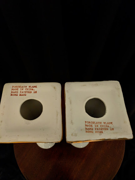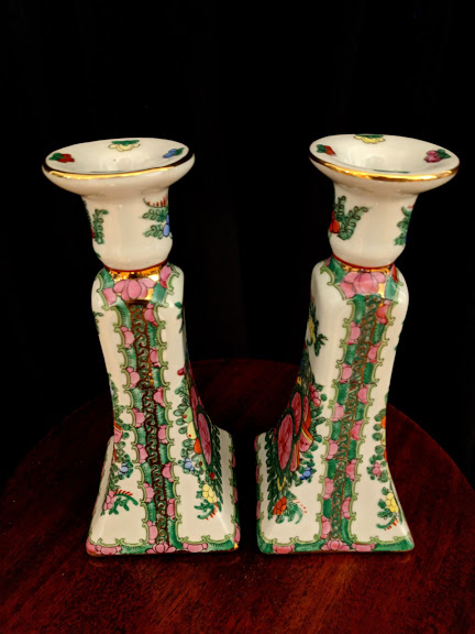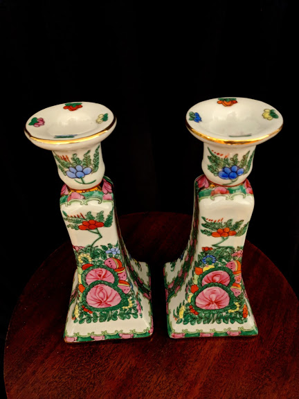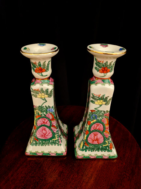 These eye-catching and stylish candlesticks will certainly add a touch of color to any room! Done in a style that is very reminiscent of of the very popular and collectible Satsuma designs, without the price tag! They are made of porcelain, and hand painted, made in Hong Kong.