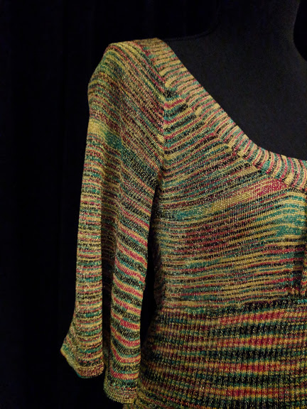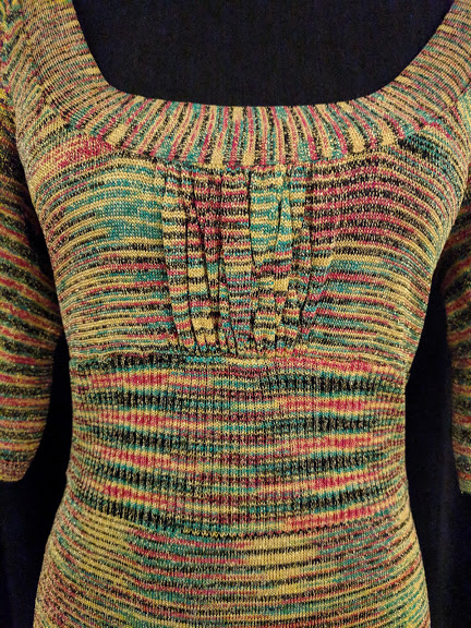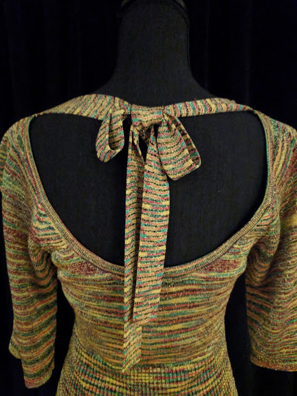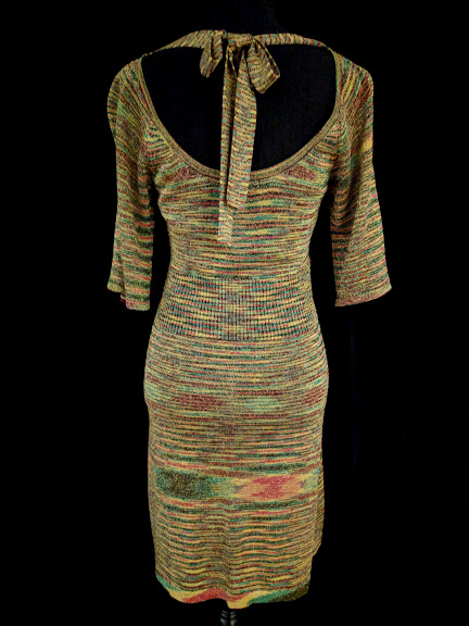 Made by Guess Jeans, this sweater dress is stylish and modern yet retro, all in one package! With it’s heathered pattern, vivid color variations and tied neckline, it would fit right in at a 60’s themed party. Just wear it with a pair of tan suede boots and add your favorite gypsy or hippy type accessories! Maybe a cool pair of peacock feather drop earrings, and/or a beaded leather headband! With it’s half sleeves and below the knee length, it gives off just enough conservative vibe to translate into a classic funky-cool dressy-casual look that can take you pretty much anywhere you’d like to have all eyes on you!